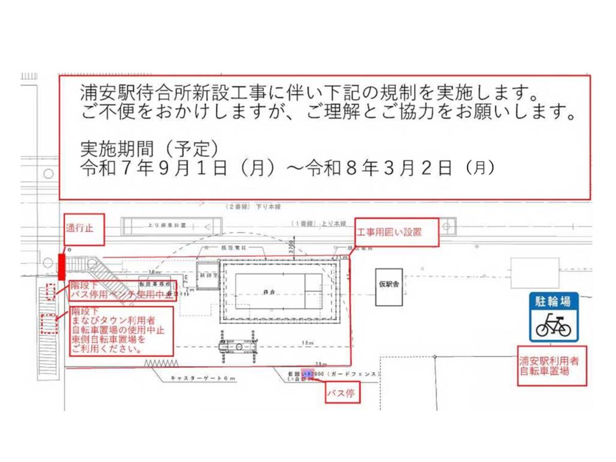 浦安駅待合所新設工事に伴い、9月1日から下記の規制を行います。